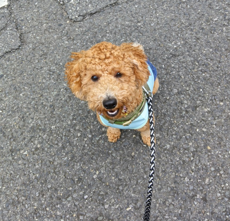 例えば、『天気がいいね』、『風が気持ちいいね』、『にぎやかだね』、『子供が沢山いるね』、『どこへ行く』などから始まり、立ち止まった時には『どうしたの』ウンチ時には『ゆっくりでいいよ』何か物音がしたときには『大丈夫だよ』など様々なシチュエーションで話しかけてましょう。(知らない人が見ると変な人に思われるかも。でも気にしない)
